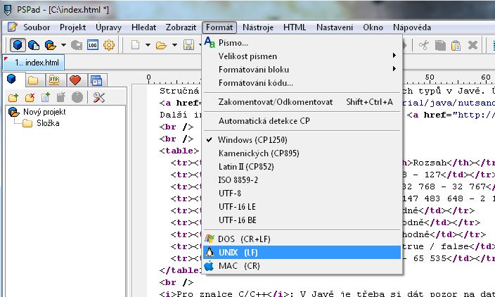 Podobným způsobem lze změnit i konce řádek. Ve stejné nabídce Formát -> zvolte UNIX (LF).